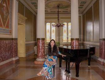 Keywords: people person woman female piano antiques fashion dress hair happy white self portrait selfie villa cortine palace stained glass caucasian cheerful v lake garda sirmione italy enjoyment leisure relaxation elegant victorian