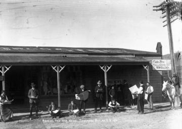 | Keywords: blackandwhite monochrome black and white Group of men (including two shop assistants) reading the war news outside the general store in Tokomaru Bay. A group of children and a male teacher are standing on the verandah gathered around the `War News' noticeboard. The shop front window displaying items of clothing can be seen behind the men in the centre of the photograph. Sign on the righthand side of the store reads `Oates Bros, Tailoring Dept. W. McCulloch, manager'. Photograph possibly taken by Oates Bros of Tokomaru Bay, ca 1915. Inscriptions: Inscribed - Photographer's title on negative -bottom centre: Reading the war news. Tokomaru Bay. No O.B. 196. Quantity: 1 b&w original negative(s). Physical Description: Cellulosic film negative People reading the war news in Tokomaru Bay. Price, William Archer, 1866-1948 :Collection of post card negatives. Ref: 1/2-001260-F. Alexander Turnbull Library, Wellington, New Zealand. natlib.govt.nz/records/23210758 Group of men (including two shop assistants) reading the war news outside the general store in Tokomaru Bay. A group of children and a male teacher are standing on the verandah gathered around the `War News' noticeboard. The shop front window displaying items of clothing can be seen behind the men in the centre of the photograph. Sign on the righthand side of the store reads `Oates Bros, Tailoring Dept. W. McCulloch, manager'. Photograph possibly taken by Oates Bros of Tokomaru Bay, ca 1915. Inscriptions: Inscribed - Photographer's title on negative -bottom centre: Reading the war news. Tokomaru Bay. No O.B. 196. Quantity: 1 b&w original negative(s). Physical Description: Cellulosic film negative People reading the war news in Tokomaru Bay. Price, William Archer, 1866-1948 :Collection of post card negatives. Ref: 1/2-001260-F. Alexander Turnbull Library, Wellington, New Zealand. natlib.govt.nz/records/23210758 |