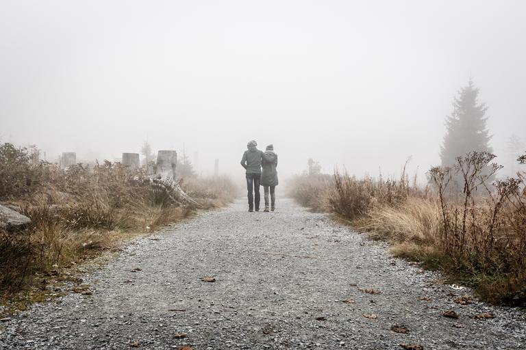 Keywords: people walking path foggy fog couple rural nature outdoors walk