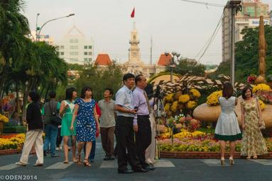 Keywords: people walking street flowers city vietnam saigon happy spring