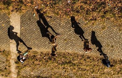 Keywords: people walking strolling footpath way plastered cobblestones shadows above aerial perspective group pedestrians lookout
