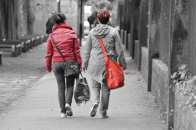 Keywords: people woman girl mother daughter family friends black white red walking shopping selection colors city trip two