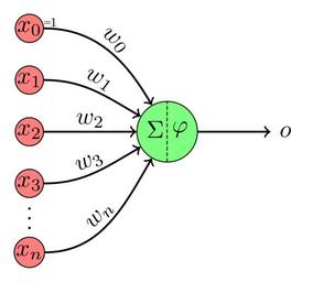 | Keywords: Perceptron-unit.svg en An artificial neuron It has input nodes <math>x_0 \dots x_n</math> weights <math>w_0 \dots w_n</math> The input signals get multiplied with the weights The results are summed up Then the activation function <math>\varphi</math> is applied e g sigmoid tanh ReLU This is then the output <math>o</math> of the artificial neuron Overall the perceptron unit is a function <math>f x_0 \dots x_n \varphi \sum_ i 0 n w_i x_i </math> Typical choices for activation functions <math>\varphi</math> are the sigmoid function <math>\varphi x \frac 1 1+e -x </math> or ReLU <math>\varphi x \max 0 x </math> The input <math>x_0</math> is called the bias and is constant 1 so <math>x_0 1</math> ff7d7d Input-Neuronen 7dff7d Hidden-Neuron de Ein künstliches Neuron Es hat Eingabeknoten <math>x_0 \dots x_n</math> Gewichte <math>w_0 \dots w_n</math> Die Eingabesignale werden jeweils mit den Gewichten multipliziert Die Ergebnisse werden aufsummiert Dann wird auf die Summe die Aktiviertungsfunktion <math>\varphi</math> z B die Sigmoid-Funktion tanh ReLU angewendet Die Perzeptron-Einheit beschreibt also eine Funktion <math>f x_0 \dots x_n \varphi \sum_ i 0 n w_i x_i </math> Zwei typische Aktivierungsfunktionen <math>\varphi</math> sind die Sigmoidfunktion <math>\varphi x \frac 1 1+e -x </math> und ReLU <math>\varphi x \max 0 x </math> Der Eingabeknoten <math>x_0</math> wird Bias genannt und ist konstant 1 also <math>x_0 1</math> ff7d7d Input-Neuronen 7dff7d Hidden-Neuron own MartinThoma 2014-07-21 ValidSVG Source is available at https //github com/MartinThoma/LaTeX-examples/ github See also Multilayer Perceptron 500px Images by Martin Thoma/Computer Science Perceptrons Quality images by Martin Thoma TikZ diagrams Quality images - valid vector Cc-zero QualityImage |