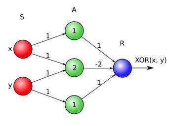 | Keywords: Perceptron XOR task.svg Пе цепт он Розенблатта с одним ск ытым слем способен вычислить функцию XOR Числа внут и А-элементов это их по оговые значения если сумма поступающих сигналов меньше этого по ога то A-элементы не пе едают дальше ничего Числа ядом со ст елками это веса связей A three layer Perceptron net capable of calculating XOR The numbers within A-elements represent each perceptrons' explicit threshold The numbers that annotate arrows represent the weight of the inputs This net assumes that if the treshhold is not reached zero not -1 is output Note that the left layer of inputs is not always considered a real perceptron layer own 2009-01-19 Alex Krainov File XOR perceptron net png png PD-version created by Robert ensor Created with Inkscape Perceptrons Exclusive or and related functions |