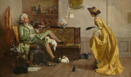 | Keywords: Percy Thomas MacQuoid Peg Woffington visiting an eccentric cat lover.jpg Peg Woffington visiting an eccentric cat lover signed also indistinctly inscribed on a label attached to the reverse oil on canvas 72 x 118 cm http //www bonhams com/auctions/13529/lot/259/ by 1925 Percy Thomas MacQuoid 1852-1925 PD-old-70 Percy Thomas MacQuoid Rococo revival paintings People with cats in art Margaret Woffington Images from Bonhams | ||||