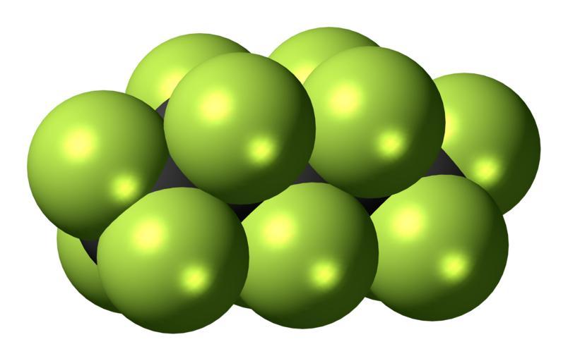 Keywords: Perfluoropentane 3D spacefill.png Space-filling model of the perfluoropentane molecule also known as perflenapent a fuorocarbon used as a contrast medium Color code 505050 Carbon C black<br> C8FA64 Fluorine F yellow-green<br> 2011-12-17 own DS Visualizer Jynto talk Ball-and-stick version cc-zero Images by Jynto Perfluorocarbons Contrast agents |