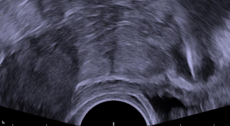 | Keywords: Perforated IUD.jpg Transvaginal ultrasonography showing an IUD with copper as a hyperechoic rendered as bright line at right 3 centimeters away from the uterus at left The IUD is surrounded by a hypoechoic dark foreign-body granuloma The urinary bladder is seen beneath it close the the circular tip of the ultrasound probe at the bottom <P> The patient was a 29 year old woman who had a painful IUD insertion 2 months earlier thumb Follow-up en Projectional radiography plain film radiography of the same case 2014-12-18 own Mikael Häggström other versions cc-zero Uploaded with UploadWizard Vaginal ultrasonography Intrauterine devices |
