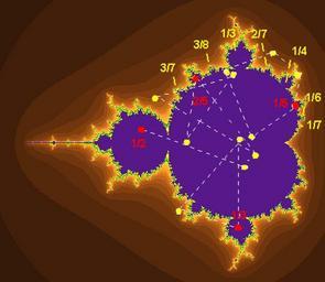 | Keywords: Periodic cycles.png Periodic cycles in Mandelbrot set own 2007-03-20 António Miguel de Campos - en User Tó campos Public domain Notice that in 2/5 bulb there is a cycle of period 5 and the trajectory of the periodic cycle jumps always 2 components counterclockwise in each iteration i e the cycle rotates by 2/5 of a revolution in each iteration The p in p/q works as a rotation parameter In the bottom part of the Mandelbrot set the cycles rotate clockwise The bulbs are ordered as a sequence of decreasing rational numbers p/q 1/2 3/7 2/5 3/8 1/3 2/7 1/4 1/5 1/6 1/7 etc Notice that the bulb between the 2/5-bulb and the 1/2-bulb is the 3/7-bulb 2/5+1/2 3/7 ; and in the middle of the 3/7-bulb and 1/2-bulb there is also a 4/9-bulb 3/7+1/2 4/9 ; etc Mandelbrot sets whole Mandelbrot set properties |