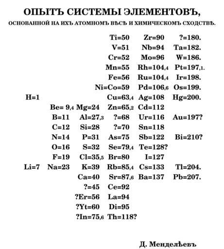 MAKE A MEME View Large Image Periodic table by Mendeleev, 1869.svg en Periodic table by Mendeleev 1869 Title translates An experiment on a system of elements based on their atomic weights and chemical similarities non-modern Russian https //en wikipedia org/w/index php ...