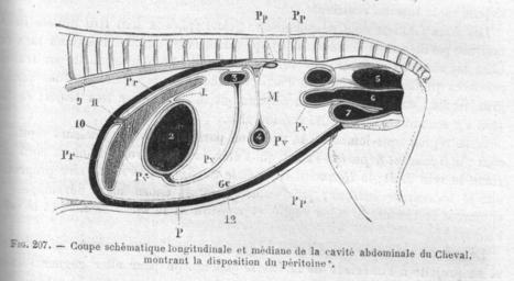 | Keywords: PeritoineChauveauCM1890.jpg en The peritoneum of the horse Equus caballus fr Schéma du péritoine du cheval Equus caballus <br /> Vicères abdominaux -1 foie -2 estomac -3 intestin grêle -4 côlon flottant origine -5 rectum -6 utérus et vagin -7 vessie <br /> Vaisseaux muscles et ligaments -9 aorte postérieure -10 diaphragme -11 veine cave postérieure -12 paroi abdominale inférieure L ligament hépato-gastrique <br /> Péritoine Pp péritoine pariétal Pv péritoine viscéral M mésentère Ge grand épiploon <br /> ” Chauveau Auguste Arloing Saturnin Traité d'anatomie comparée des animaux domestiques <br /> 1 064 p page 449 1890 Paris Lib J B Baillière et Fils domaine public décès des auteurs 1917 et 1911 Meyer Ch 2011-03-17 PD-old Horse anatomy schemes Abdomen |