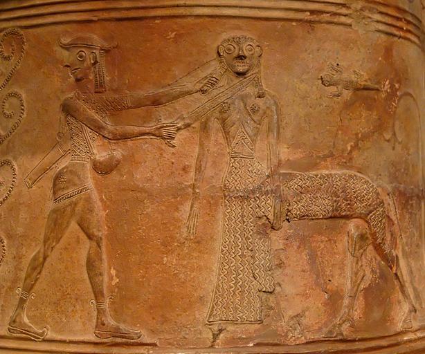 | Keywords: Perseus Medusa Louvre CA795.jpg artist Perseus left wearing a hat winged boots and the kibisis slung over his shoulder averts his gaze as he kills Medusa figured here as a female centaur Detail from an orientalizing relief pithos Persée à gauche portant un chapeau et des bottes ailées avec la kibisis sur l'épaule détourne le regard pendant qu'il tue Méduse représentée ici comme un centaure femelle Détail d'un pithos orientalisant à reliefs ca 660 BC terracotta ; decoration incised decoration stamped cm 130 Institution Louvre room ID not on view object department Greek Etruscan and Roman antiquities 5042 object history Thebes Greece Boeotia credit line ProvenanceEvent purchase 1897 accession number Louvre number 795 Marie-Lan Nguyen 2007 other versions Ancient Greek pottery in France Paris 7th-century BC reliefs 660s 660s BC pottery Perseus and Medusa in sculpture Talaria Pithoi Boeotian Orientalizing pottery Greek antiquities in the Louvre - Room 1 |