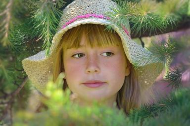 Keywords: person human child girl hat face blond summer green portrait close