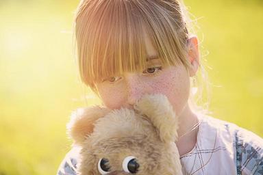 Keywords: person human child girl blond face view teddy teddy bear portrait close sunlight lighting