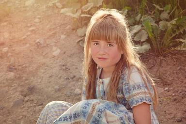 Keywords: person human child girl blond face long hair out nature evening sun lighting portrait