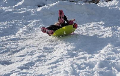 Keywords: person human child ride on slip downhill winter snow fun in motion in action