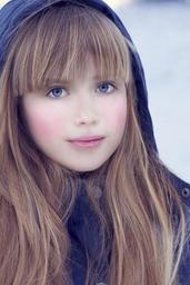 Keywords: person human female face blue eyes long hair hood winter out portrait close