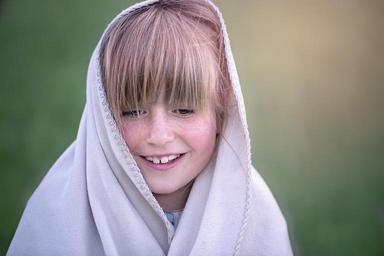 Keywords: person human female girl face view blanket wrapped up portrait close