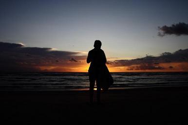 Keywords: person human leisure beach silhouette twilight sun sunset sky evening mood atmosphere landscape romantic