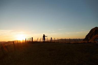 Keywords: person human standing pointing silhouette sunset backlit outdoor nature fence rock golden glow