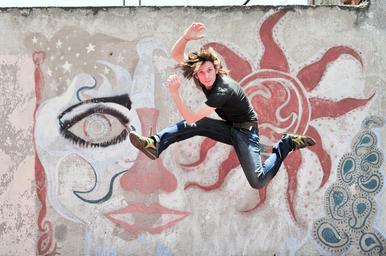 Keywords: person male jumping concrete wall graffiti happy man lifestyle active snapshot