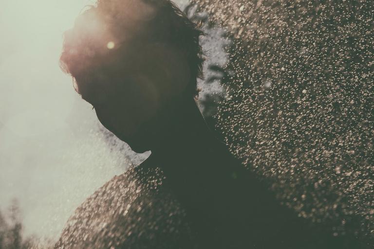 Keywords: person shaking head droplets water turning splash summer sunshine outdoors refreshing fresh silhouette spray liquid motion