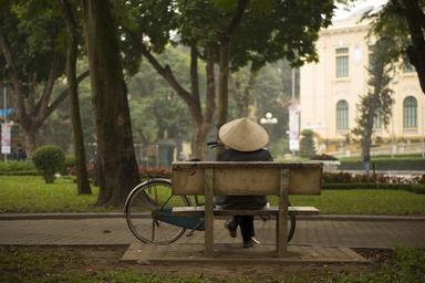 Keywords: person sitting relaxing bench park hat asian bike break rest trees