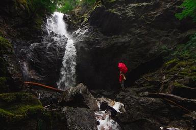 Keywords: person umbrella waterfall water spray stream river fall rocks wet protected red blonde girl female waterproof craggy cascade flow motion creek brook