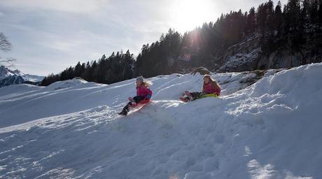 Keywords: personal human children girl bob ride on slip downhill winter snow sunshine fun joy winter fun