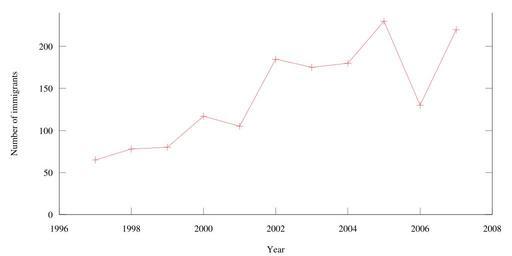 | Keywords: Peru-immigration-stats.svg en Graph of Peruvians immigrants granted UK citizenship by year 1997-2007 Source http //www fade nhs uk/cash/index php/2008/07/11/home-office-statistical-data/ NHS immigration statistics Own Olaf Davis 2009-04-30 Immigration in the United Kingdom Charts of Peru Sociological diagrams Line charts |