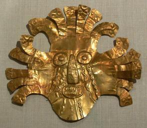 | Keywords: Peru Nasca Headdress ornament DMA 1976-W-531.jpg Gold headdress ornament; Nasca Peru 400 B C - A D 600; 18 4 x 20 5 cm; <br />Dallas Museum of Art Dallas Texas; The Nora and John Wise Collection loan ; object number 1976 W 531 own 2009-10 Photo User FA2010 Pre-Columbian art in the Dallas Museum of Art Nazca gold objects |