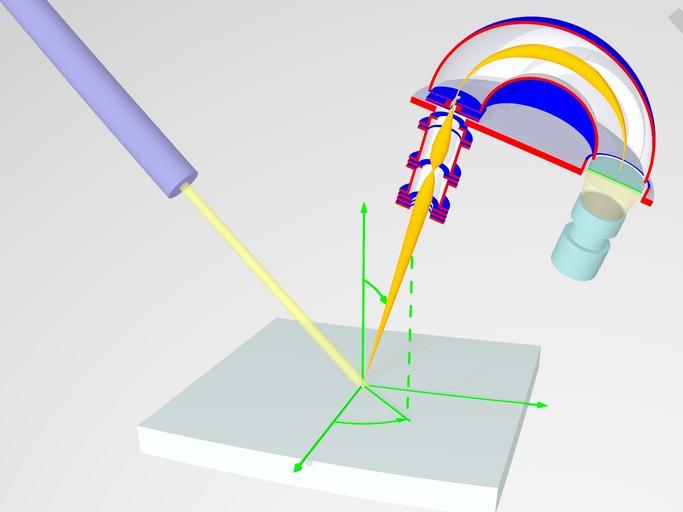 | Keywords: PES2.jpg Created with Persistence of Vision en principle of Angle Resolved Photo Electron Spectroscopy Own Saiht 2009-06-15 Script in POVray <pre> // Schnitt durch ein PhotoelectronSpetroskopie Experiment // by Matthias Kreier version 0 8; global_settings assumed_gamma 1 0 default finish ambient 0 6 diffuse 0 4 include colors inc include textures inc camera ultra_wide_angle angle 48 location <20 30 -65> look_at <-2 12 0> //plane <0 1 0> -1 pigment color Red //plane <0 0 -1> -50 pigment color White plane <0 1 -1> -2000 pigment color LightGray // Linsensystem zur Fokussierung und Retardierung declare Linsensystem union difference union box <-2 1 3 0 -2 1> <2 1 3 2 2 1> box <-2 1 3 4 -2 1> <2 1 3 6 2 1> box <-2 1 3 8 -2 1> <2 1 4 0 2 1> box <-2 1 6 8 -2 1> <2 1 7 0 2 1> pigment color Blue cylinder < 0 2 9 0 > <0 7 1 0> 0 81 pigment color Silver cylinder < 0 2 9 0 > <0 7 1 0> 2 pigment color Silver inverse difference union cylinder < 0 4 2 0 > <0 4 4 0> 2 1 cylinder < 0 4 3 0 > <0 6 5 0> 1 4 cylinder < 0 6 4 0 > <0 6 6 0> 2 1 cylinder < 0 7 2 0 > <0 7 4 0> 2 1 cylinder < 0 7 3 0 > <0 9 9 0> 1 4 cylinder < 0 9 8 0 > <0 10 0> 2 1 cylinder < 0 10 2 0 > <0 10 4 0> 2 1 cylinder < 0 10 3 0 > <0 11 2 0> 1 4 cylinder < 0 4 1 0 > <0 11 0> 1 2 pigment color Silver cylinder < 0 10 9 0 > <0 11 3 0> 0 8 pigment color Silver cylinder < 0 4 1 0 > <0 11 3 0> 2 pigment color Silver inverse translate <0 1 0> declare Kugelanalysator union intersection // innere Kugel difference sphere <6 14 0> 4 2 texture Polished_Chrome sphere <6 14 0> 4 pigment color Blue box <1 14 -1> <11 19 5> pigment color Red intersection // äußere Kugel difference sphere <6 14 0> 8 pigment color Blue sphere <6 14 0> 7 8 pigment color Silver box <-3 14 -1> <15 23 9> pigment color Red difference // Herzog-Platte cylinder < 6 12 5 0 > < 6 13 0 > 9 pigment color LightSteelBlue cylinder < 0 12 4 0> <0 13 1 0> 1 1 pigment color Silver cylinder < 12 12 4 0> <12 13 1 0> 2 3 difference cylinder < 12 12 5 0 > < 12 13 8 0 > 2 4 pigment color Blue cylinder < 12 12 4 0> < 12 13 9 0> 2 2 pigment color Silver intersection // Eingangsspalte union box <-2 13 25 -2> <2 13 35 2> pigment color Blue box <-0 6 13 3 -2> <0 6 13 75 2> pigment color Blue box <-0 2 13 2 -2 1> <0 2 14 1 2 1> pigment color Silver inverse intersection // Eingangsblenden union cylinder < 0 13 85 0 > < 0 13 9 0 > 2 pigment color Blue cylinder < 0 13 1 0 > < 0 13 15 0 > 2 pigment color Blue box <-0 15 13 0 -1> <0 15 14 1 1> pigment color Silver inverse declare Optik union object Linsensystem pigment color Blue object Kugelanalysator rotate<0 0 0> declare Scienta union intersection // Linsensystem und Analysator entlang x aufgeschnitten object Optik box <-3 2 0> <15 23 9> pigment color Red intersection //aufgeschnitten union cylinder <12 13 3 0> <12 13 8 0> 2 pigment color CadetBlue // Channelplate cylinder <12 13 0 0> <12 13 2 0> 2 pigment color Green // Phosphorplatte box <9 10 0> <15 15 9> pigment color rgbf <1 1 1 1> difference // CCD Kamera cylinder <12 9 5 0> <12 11 0> 1 8 pigment color CadetBlue cylinder <12 10 0> <12 11 1 0> 1 6 pigment color Black cylinder <12 9 6 0> <12 8 0> 1 4 pigment color CadetBlue cylinder <12 8 1 0> <12 5 5 0> 1 8 pigment color CadetBlue cone <12 11 0> 1 6 <12 13 0> 2 texture pigment rgbf<1 1 0 8 0 7> // Weg der Elektronen declare Elektron1 union cone < 0 0 0 > 0 <0 21 5 0> 0 6 cone < 0 21 5 0 > 0 6 <0 23 0> 0 4 cone < 0 23 0 > 0 4 <0 24 2 0> 0 03 cone < 0 24 0 > 0 03 <0 25 0> 0 5 cone < 0 25 0 > 0 5 <0 26 0> 0 6 cone < 0 26 0 > 0 6 <0 27 0> 0 5 cone < 0 27 0 > 0 5 <0 29 5> 0 05 cone < 0 29 5 0> 0 05 <0 30 0> 0 1 intersection intersection torus 6 0 5 rotate<-3 8 0 0> translate <0 0 46 0> torus 6 0 5 rotate< 3 8 0 0> translate <0 -0 46 0> torus 6 0 7 translate <-0 67 0 0> torus 6 0 7 translate < 0 67 0 0> rotate<90 0 0> translate<6 30 0> // torus 6 0 1 rotate < 90 0 0 > translate<6 30 0> box <-2 30 -2> <13 39 2> declare Elektron2 union intersection intersection torus 6 0 5 rotate<-3 8 0 0> translate <0 0 46 0> torus 6 0 5 rotate< 3 8 0 0> translate <0 -0 46 0> torus 6 0 7 translate <-0 67 0 0> torus 6 0 7 translate < 0 67 0 0> rotate<90 8 0> translate<6 14 0> box <-2 14 -2> <13 23 2> cone < 0 11 0 9 > 0 2 <0 14 1 0 9> 0 05 cylinder < 0 5 95 0 9 > <0 11 0 9> 0 2 cone < 0 0 0 > 0 <0 6 0 9> 0 2 declare Elektron3 union intersection intersection torus 6 0 5 rotate<-3 8 0 0> translate <0 0 46 0> torus 6 0 5 rotate< 3 8 0 0> translate <0 -0 46 0> torus 6 0 7 translate <-0 67 0 0> torus 6 0 7 translate < 0 67 0 0> rotate<90 -10 0> translate<6 14 0> box <-2 14 -2> <13 23 2> cone < 0 11 -0 9 > 0 2 <0 14 1 -0 9> 0 05 cylinder < 0 4 95 -0 9 > <0 11 -0 9> 0 2 cone < 0 0 0 > 0 <0 5 -0 9> 0 2 declare Lichtquelle union cylinder <-18 18 0> <1 -1 0> 0 5 texture pigment rgbf<1 1 0 6 0 7> difference cylinder <-17 5 17 5 0> <-40 40 0> 1 8 cylinder <-17 4 17 4 0> <-20 20 0> 0 5 pigment color RichBlue declare Sample union box <-14 8 -2 5 -14 8> <14 8 0 14 8> pigment color LightBlue union // Koordinatensystem cylinder < 0 0 0 > < 16 1 0 0 > 0 1 cylinder < 0 0 0 > < 0 16 1 0 > 0 1 cylinder < 0 0 0 > < 0 0 -16 1> 0 1 cone < 16 0 0 > 0 3 < 17 0 0 > 0 cone < 0 16 0 > 0 3 < 0 17 0 > 0 cone < 0 0 -16> 0 3 < 0 0 -17> 0 intersection torus 8 0 1 box < 0 -0 1 -8 1 > < 5 66 0 1 -5 66> cylinder < 0 0 0 > < 6 0 -6 > 0 1 intersection torus 10 0 1 box < 0 -0 1 -10 1 > < 4 8 0 1 -4 8> rotate <90 45 0> cone < 5 66 0 -5 66 > 0 < 5 0 -6 3 > 0 3 cone < 3 38 8 8 -3 38> 0 < 2 5 9 3 -2 5> 0 3 pigment color Green cylinder < 5 66 15 -5 66> < 5 66 0 -5 66 > 0 1 pigment checker color Green color rgbf <1 1 1 1> // alles zusammenbauen object Scienta translate < 0 16 0 > rotate < -20 0 -20 > object Elektron1 pigment color Orange rotate < -20 0 -20 > //object Elektron2 pigment color rgbf <1 0 6 0 0 8> //object Elektron3 pigment color rgbf <1 1 0 0 8> object Lichtquelle object Sample // Lichtquellen light_source <-60 28 -200> color White light_source // <0 26 -20> // <30 30 -45> <20 30 -65> colo
