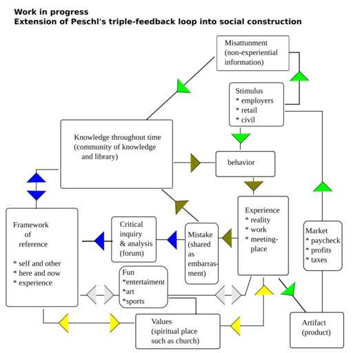 | Keywords: Peschls three loops extended to social construction.svg en <br>If critical inquiry is halted by removing the forum there is no path to knowledge except through mistake the forum may have been disrupted or perverted The obvious available option is to keep things working is to stay in the inner loop where there is only mistake Another option is to create connections to other boxes such as connecting mistake to the frame of reference but this will update the frame with mistaken information resulting in low esteem and depression and I am afraid desperation The poor esteem and efficacy created by mistake and motivated by depression to desperation will attract the wrong crowd such as desperadoes who will corrupt the framework for instance with cocaine or meth Another option to attempt is to create a connection to Values in an attempt to update the framework with healthy non-mistakes through morality--but two problems appear The value system found in Values will act to suppress or alter the desperation depression and low self esteem by for instance in Christianity forgiving those who caused the problem in the first place who destroyed the forum employers Or Value might be affected by the desperation and as happened to the framework attract desperadoes corrupting the values <br><br>The the Artifact that is central to constructivism http //web media mit edu/~mres/ Mitchel Resnick is not central to the diagram but has been pulled off into the employment loop except to borrow from the individual's and presumably the community's knowledge--but only as learned from mistake It is safe to say that values have not part in the employment cycle as it is illegal under business law to do anything that does not directly create shareholder profits Artifacts are crucial to constructivsm; they are the focus for instance of constructivst therapy; the artifact has been stolen <br><br>Where is education in this picture Constructivst education would be complete with the insertion of the Artifact into the center but didactic education has to be parallel as a business as it operates for profit even if it has been socialized As didactic information is supplied with little back talk ; this was mis-attunement to Carl Rogers as it was not the product of experience and probably misinformation So another box has been placed above Knowledge for inserted knowledge that is separate from the collective experience <br><br>This material is referenced in the http //en wikibooks org/wiki/User John_Bessa/Saving_Constructivism Original work-> http //thinman com/john_bessa/text/peschls_three_loops_extended_to_social_construction svg John Bessa 2011-12-20 Most recent version-> http //thinman com/john_bessa/text/peschls_three_loops_extended_to_social_construction svg Constructivism Social construction Sociology |