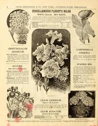 | Keywords: Peter Henderson and Co.'s August to December 1901 wholesale catalogue of bulbs, plants and seeds, tools, fertilizers, insecticides, and requisites for the greenhouse, garden and farm (16236603263).jpg PETER HENDERSON CO NEW YORK SUPERIOR BULBS WHOLESALE <br> ORNITHOGALUM ARABICL'M <br> ORNITHOGALUM <br> ARABICUM <br> Star of Bethlehem A beautiful var- <br> iety throwing up a tall spike bearing <br> numerous large milk-white star- <br> shaped flowers with a black centre <br> and having a distinct aromatic per- <br> fume Largely forced by florists for <br> cut flowers <br> 36c per doz 1 50 per 100 12 00 per 1000 <br> ALLIUMS <br> FOR WINTER FORCING <br> Hermittl Grandiflorum A splendid <br> winter flowering and forcing variety ; <br> the flowers of immaculate whiteness <br> last a long time after being cut <br> Blooms from December to the end of <br> April <br> 16c per doz 75c per 100 0 50 per 1000 <br> Neapolltanum Another excellent var- <br> iety for winter flowering extensively- <br> forced by florists for cut flowers be- <br> ing of pure white with green stamens <br> borne in large loose umbels <br> 10c per doz 50c per 100 4 50 per 1000 <br> MISCELLANEOUS FLORIST'S BULBS <br> WHITE CAJXAS DRY ROOTS <br> The dry bulbs are superior for forcing purposes as they come into bloom <br> quickly and require less room making less foliage Dry bulbs planted in 4-inch <br> pots will flower nearly twice as abundantly as plants in 6-inch pots that have <br> been kept growing or only semi-dormant Delivery in Sep ember <br> PRICE OF DRY CA'LLA ROOTS <br> Mammoth Bulbs 6 ins and over in circumference 1 25 doz 10 00 100 <br> Extra Size 5 1 00 7 50 <br> First Size 4 ' 75 5 00 <br> V \tt\e Oem or lomjhumb about 12 inches high 50 3 0 <br> Dwa -f Everblooming pure while early free 2 50 18 00 <br> Elliottiana rick yellow foliage spotted white 2 00 each 20 00doz <br> CALLA ELLIOTTIANA <br> CAMPERNELLE <br> JONQUILS <br> Much prized for their large 6-lobed <br> golden yellow sweet-scented flowers <br> perfectly hardy and adapted for winter <br> forcing <br> 12c per doz 60c per 100 5 00 per 1000 <br> SPANISH IRIS <br> This type is well adapted for pot cul- <br> ture and forcing blooming in the win- <br> ter The flowers are of great beauty <br> and cut in the bud state last from one to <br> two weeks in bloom If planted in boxes <br> and placed in cold frames until they <br> show bud then brought into heat they <br> can be had in bloom from March on <br> British Queen Massive pure white <br> Leonidas Dark violet bine <br> Belle Chinoise Large golden yellow <br> Olympia Creamy yellow and light blue <br> Lllaceus Porcelain blue <br> Prince of Orange Yellow bronze and <br> blue <br> Prices of above named Spanish Iris <br> 12c per doz 65c per 100 5 00 per 1000 <br> Mixed Spanish Iris 10c per doz 85c <br> per 100 2 50 per 1000 <br> LILIUM CANDIDUM <br> SPANISH IRIS <br> LILIUM CANDIDUM <br> READY IN AUGUST <br> Annunciation Madonna or St Joseph Lily The well- <br> known Garden Lilv snow white fragrant blossoms It is <br> also one of the best forcing Lilies for florists Selected <br> large bulbs 50c per doz 3 50 per 100 32 00 per 1000 <br> LILIUM AURATUM <br> READY IN OCTOBER <br> First Size Bulbs S to o inch 0 85 doz 6 00 per 100 <br> Extra Large Bulbs 9 to 11 inch 1 25 8 50 <br> Mammoth Bulbs 11 to 13 inch 2 25 16 00 <br> For a Complete List of Lilies see page lb <br> We furnish 6 bulbs of one variety at dozen rates ; 25 at 100 rates ; 250 at 1000 rates Postage will be extra on bulbs desired by mail 42318929 133706 66577 Page 6 Text http //www biodiversitylibrary org/page/42318929 1901 10 5962/bhl title 66577 Henry G Gilbert Nursery and Seed Trade Catalog Collection ; Peter Henderson Co NameFound Calla elliottiana NameConfirmed Calla elliottiana W Watson W Watson EOLID 1127677 NameBankID 7553065 NameFound Grandiflorum NameFound Lilium auratum NameConfirmed Lilium auratum EOLID 1003309 NameBankID 5416786 NameFound Lilium candidum NameConfirmed Lilium candidum EOLID 1003297 NameBankID 2667845 NameFound Neapolltanum NameFound Ornithogalum NameConfirmed Ornithogalum L EOLID 29231 NameFound Ornithogalum arabicum NameConfirmed Ornithogalum arabicum EOLID 229708 NameBankID 5846637 Biodiversity Heritage Library Peter Henderson Co 's August to December 1901 wholesale catalogue of bulbs plants and seeds tools fertilizers insecticides and requisites for the greenhouse garden and farm Garden Stories Catalogs Fertilizers Flowers Insecticides Peter Henderson Co Plants Ornamental Seed industry and trade Seeds Trade catalogs U S Department of Agriculture National Agricultural Library bhl page 42318929 dc identifier http //biodiversitylibrary org/page/42318929 bhlGardenStories Bulbs Plants Lilium Candidum Callas Lilies Ornithogalum Arabicum BHLinbloom peter henderson co plants ornamental u s department of agriculture national agricultural library bhlgardenstories bulbs plants lilium candidum ornithogalum arabicum bhlinbloom Information field Flickr posted date ISOdate 2015-03-18 CC-BY-2 0 BioDivLibrary https //flickr com/photos/61021753 N02/16236603263 2015-08-24 19 59 27 cc-by-2 0 PD-old-70-1923 Callas lilium candidum Peter Henderson and Co 's August to December 1901 wholesale catalogue of bulbs plants and seeds tools fertilizers insecticides and requisites for the greenhouse garden and farm Photos uploaded from Flickr by FĂŚ using a script |
