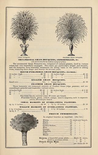 | Keywords: Peter Henderson and Co's seed catalogue (16437049925).jpg GRASS BOUQUET <br> FEATHEB GEASS BOUQUET <br> ORNAMENTAL GRASS BOUQUETS IMMORTELLES c <br> All can be sent free by mail on receipt of price <br> The ornamental Grass Bouquets are composed of natural grasses dyed in various <br> colors and very beautifully arranged The colors are particularly bright and durable <br> and the bouquets form beautiful ornaments for filling vases in the parlor or sitting <br> room retaining their shape and beauty for several years <br> ROUND PYRAMIDAL GRASS BOUQUETS ” German <br> 14 inches high 0 50 <br> 18 60 <br> 22 1 00 <br> ENGLISH GRASS <br> Small size 75c j <br> 24 inches high 1 25 <br> 28 ' 1 50 <br> 30 2 00 <br> BOUQUETS <br> Large Size ' L 00 <br> FEATHER GRASS BOUQUETS <br> These bouquets are composed entirely of Feather Grass stipa pennata and are <br> exceedingly graceful and beautiful various colors <br> 2 00 <br> 3 00 <br> 18 inches high 0 60 <br> 20 <br> 22 <br> 1 00 <br> 1 50 <br> 24 inches high <br> 28 <br> 6 by <br> 5 by <br> 5fby <br> Feather Grass natural color 30 cents per bunch <br> Feathergrass green yellow orange mauve magenta each in separate <br> colors 50 cents per bunch <br> CORAL BASKETS OF EVERLASTING FLOWERS <br> 9 inches 1 00 7£ by 10 inches 1 50 <br> WILLOW BASKETS OF EVERLASTING FLOWERS <br> inches ¢ 1 00 I 6 by 10 inches 1 75 <br> 1 25 <br> FRENCH IMMORTELLES <br> In original bunches as imported See Cut <br> White 75 cents per bunch <br> Black 75 <br> Green 75 <br> Golden Yellow 50 <br> Blue ---- 75 ' ¢ <br> Orange 75 <br> Magenta 75 <br> Lilac 75 <br> Mixed 75 <br> Bronius a beautiful grass plain Each 25 cents <br> dyed in separate colors 40 <br> French Green Moss 30 <br> – perdozen 3 00 43797090 148915 77745 Page 91 Text http //www biodiversitylibrary org/page/43797090 1875 10 5962/bhl title 77745 Henry G Gilbert Nursery and Seed Trade Catalog Collection ; Peter Henderson Co NameFound Immortelles NameConfirmed Immortelles NameBankID 277118 NameFound Lilac NameConfirmed Lilac P Miller 1754 Biodiversity Heritage Library Peter Henderson Co's seed catalogue 1875 new album Garden Stories Catalogs Equipment and supplies Gardening Peter Henderson Co Seed industry and trade Seeds Trade catalogs U S Department of Agriculture National Agricultural Library bhl page 43797090 dc identifier http //biodiversitylibrary org/page/43797090 bhlGardenStories ornamental grass bouquets BHLinbloom peter henderson co u s department of agriculture national agricultural library bhlgardenstories bhlinbloom Information field Flickr posted date ISOdate 2015-02-03 CC-BY-2 0 BioDivLibrary https //flickr com/photos/61021753 N02/16437049925 2015-08-24 05 54 18 cc-by-2 0 PD-old-70-1923 1875 books Peter Henderson Co's seed catalogue Photos uploaded from Flickr by Fæ using a script |