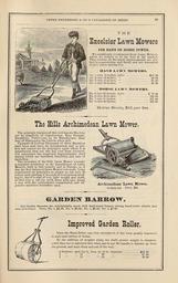 | Keywords: Peter Henderson and Co's seed catalogue (16251132627).jpg PETER HENDERSON CO 'S CATALOGUE OF SEEDS <br> THE <br> l Izcelsior Lawn M©w©f i <br> FOE HAND OR HORSE POWER <br> We confidently recommend these Lawn Mowers <br> which we believe to be the best in the market <br> They contain all the latest improvements are per- <br> fect iti construction and finish and are warranted <br> to give entire satisfaction <br> HAND LAWN MOWERS <br> No I cuts 9 inches price 15 00 <br> No 2 cuts 12 inches 20 00 <br> No 3 cuts 15 inches 25 00 <br> No 4 cuts 18 inches 30 00 <br> HORSE LAWN MOWERS <br> No 5 cuts 25 inches price 75 00 <br> No 6 cuts 30 inches 125 00 <br> No 7 cuts 35 inches 165 00 <br> No 8 cuts 40 inches 200 00 <br> Horse Boots 12 per Set <br> The Hills Archimedean Lawn Mower <br> The principle features of this well-known Machine <br> are its simplicity of Construction Easy Draught <br> Durability Perfectness in its Manufacture Easy <br> way of Sharpening the Cutters when-dull <br> Upwards of Sixteen Thousand of these Machines <br> have been sold since its introduction and so per- <br> fect and correct are the principles upon which it is <br> constructed that not one has ever been returned <br> Yet experience has suggested improvements chief <br> among which are increased durability and ease of <br> operating <br> The invention of the Hills Lawn Mower wrought <br> a complete revolution in the manufacture of Lawn <br> Mowers both in this country and in Europe as it <br> was the first balanced Lawn Mower ever made being <br> constructed on principles so simple as not only to <br> reduce cost placing it in reach of every person need- <br> ing it but it is also of very light weight and draft <br> so that even a lad can work them with ease doing <br> a way with the cumbersome complicated and ex- <br> pensive machines heretofore used <br> Archimedean Lawn Mower <br> 14 inch cut Price 25 <br> r <br> Our Garden Barrows are substantially made with hard-wood frames strong hand-made wheels and <br> iron axle-boxes Price No 1 4 50; No 2 6 00; No 3 6 50; No 4 7 00 <br> siprojfi lailii Rollw <br> Since the Hand Roller was first introduced it has been greatly improved <br> in style and variety of forms <br> By the addition of weights along the shaft greater weight is obtained <br> while they are so adjusted that when not in use the handle is thrown up from <br> the ground and kept clean and out of the way <br> 2 Sections each 7 £ in long by 15 in diameter 12 00 <br> 2 12 20 25 00 <br> 2 12 24 30 00 43797088 148915 77745 Page 89 Text http //www biodiversitylibrary org/page/43797088 1875 10 5962/bhl title 77745 Henry G Gilbert Nursery and Seed Trade Catalog Collection ; Peter Henderson Co Biodiversity Heritage Library Peter Henderson Co's seed catalogue 1875 new album Garden Stories Catalogs Equipment and supplies Gardening Peter Henderson Co Seed industry and trade Seeds Trade catalogs U S Department of Agriculture National Agricultural Library bhl page 43797088 dc identifier http //biodiversitylibrary org/page/43797088 bhlGardenStories BHLinbloom peter henderson co u s department of agriculture national agricultural library bhlgardenstories bhlinbloom Information field Flickr posted date ISOdate 2015-02-03 CC-BY-2 0 BioDivLibrary https //flickr com/photos/61021753 N02/16251132627 2015-08-24 05 55 00 cc-by-2 0 PD-old-70-1923 1875 books Peter Henderson Co's seed catalogue Photos uploaded from Flickr by Fæ using a script |