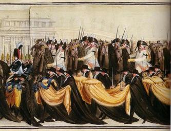 | Keywords: Peter III of Russia's burial det10.jpg Вто ичные похо оны Пет а III 2 декаб я 1796 г Составить п едставление о том как выглядела т ау ная п оцессия мы можем по ее изоб ажению сделанному неизвестным по всей ве оятности итальянским художником Изоб ажение это п едставляет собой улон длиной 15 8 м и ши иной 0 75 м За ними следует шествие духовенства с хо угвями и це ковный хо есколько гене алов несут на подушках о дена и две земельные ко оны Пет а III соп овождаемые ст оем лейб-гуса и Ки аси ского наследника полка а фоне п оцессии выделяются ца ский жезл и скипет и Большая импе ато ская ко она кото ую по п иказанию Павла I несли г аф А Ф О лов князь П Б Ба ятинский и П Б Пассек - участники убийства импе ато а http //babs71 livejournal com/196710 html ~ 1796 Italian anonimous Peter III's burials 1796 Files uploaded by Shakko from various sources Alexey Orlov-Chesmensky House of Passek Russian Crown Jewels Empire PD-Art |