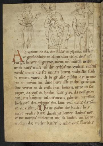| Keywords: Pfaffe Konrad - Rolandslied - cod. pal. germ. 112 - 012.jpg Pfaffe Konrad - Rolandslied - cod pal germ 112 - jpg 011 013 Kaiser Karl berät sich mit Roland l und Olivier r Rolandslied des Pfaffen Konrad à bersetzung bzw Bearbeitung der altfranzösischen Chanson de Roland um 1100 Blatt 5v Pfaffe Konrad Rolandslied Pergament 123 Blatt 21x15 cm Regensburg/Hessen-Thüringen Ende 12 Jahrhundert Cod pal germ 112 Universitätsbibliothek Heidelberg http //diglit ub uni-heidelberg de/diglit/cpg112 century 12 Pfaffe Konrad PD-old Rolandslied Cod Pal germ 112 Medieval miniatures of Carolus Magnus Roland |