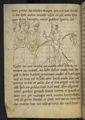 | Keywords: Pfaffe Konrad - Rolandslied - cod. pal. germ. 112 - 044.jpg Pfaffe Konrad - Rolandslied - cod pal germ 112 - jpg 043 045 Geneluns sinnt auf Rache bei der Abreise nach Sarraguez Rolandslied des Pfaffen Konrad à bersetzung bzw Bearbeitung der altfranzösischen Chanson de Roland um 1100 Blatt 21v Pfaffe Konrad Rolandslied Pergament 123 Blatt 21x15 cm Regensburg/Hessen-Thüringen Ende 12 Jahrhundert Cod pal germ 112 Universitätsbibliothek Heidelberg http //diglit ub uni-heidelberg de/diglit/cpg112 century 12 Pfaffe Konrad PD-old Rolandslied Cod Pal germ 112 |