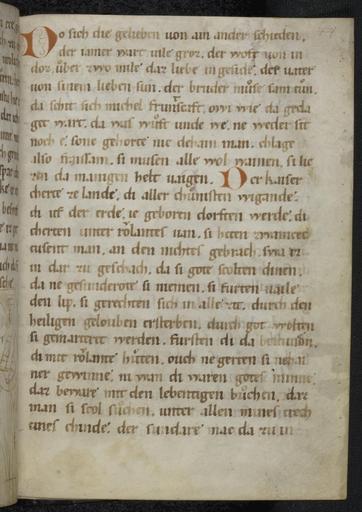 Keywords: Pfaffe Konrad - Rolandslied - cod. pal. germ. 112 - 089.jpg Pfaffe Konrad - Rolandslied - cod pal germ 112 - jpg 088 090 Rolandslied des Pfaffen Konrad à bersetzung bzw Bearbeitung der altfranzösischen Chanson de Roland um 1100 Blatt 44r Pfaffe Konrad Rolandslied Pergament 123 Blatt 21x15 cm Regensburg/Hessen-Thüringen Ende 12 Jahrhundert Cod pal germ 112 Universitätsbibliothek Heidelberg http //diglit ub uni-heidelberg de/diglit/cpg112 century 12 Pfaffe Konrad PD-old Rolandslied Cod Pal germ 112