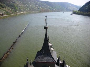 | Keywords: PfalzgrafensteinTurmblickSüd.JPG de Blick aus dem Dachfenster des Burgturms der Pfalzgrafenstein nach Süden Zu sehen ist links im Rhein das Leitwerk das zur Insel Kauber Werth führt Quer zum Leitwerk lassen sich nach rechts durch Wellenbildung mindestens fünf bis sechs Buhnen unterscheiden die bei dem aktuellen Kauber Pegel von 289 cm unter Wasser stehen Ihre Länge macht deutlich dass die Fahrrinne des Rheins wegen Untiefen in weitem Abstand westlich am Pfalzgrafenstein vorbeiführt own Brühl 2009-05-10 Burg Pfalzgrafenstein |