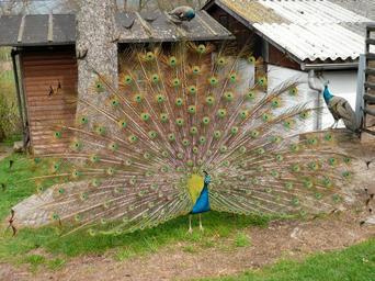 Keywords: PfauVonVorne.jpg en Peacock seen from front Own Ramessos 2009-04 Pavo cristatus captive male display