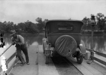 | Keywords: blackandwhite monochrome black and white A man pushes a ferry loaded with a car off its dock with a pole. The rear of a car can be seen. c.1927 From the Pryor Emerson Humphrey Photograph Collection, PhC.180, State Archives of North Carolina, Raleigh, NC. A man pushes a ferry loaded with a car off its dock with a pole. The rear of a car can be seen. c.1927 From the Pryor Emerson Humphrey Photograph Collection, PhC.180, State Archives of North Carolina, Raleigh, NC. | ||||