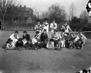 | Keywords: blackandwhite monochrome outdoor black and white Group picture of Meredith College tennis club members with Governor's Mansion in background; Raleigh, NC. Photograph appears in the 1916 "Oak Leaves" Meredith College yearbook, page 83. Individuals identified include, Elsie Riddick, Helen Byrd Aydlett, Mary Farrell, Louise Holding, Annie Laurie Baucom, French Haynes, Essie Daniels, May Carter, Annie Lowry, Vivian McNeil, Rosa Wishart, Carrie Lowry, Pearl Faulkner, Ethel English, Kate Copple, Elizabeth Chapin, Lillian Haislip, and Madeline Higgs. c. 1916 (8"x10" glass plate negative). From the J. C. Knowles Photograph Collection, State Archives of North Carolina, Raleigh, NC. Group picture of Meredith College tennis club members with Governor's Mansion in background; Raleigh, NC. Photograph appears in the 1916 "Oak Leaves" Meredith College yearbook, page 83. Individuals identified include, Elsie Riddick, Helen Byrd Aydlett, Mary Farrell, Louise Holding, Annie Laurie Baucom, French Haynes, Essie Daniels, May Carter, Annie Lowry, Vivian McNeil, Rosa Wishart, Carrie Lowry, Pearl Faulkner, Ethel English, Kate Copple, Elizabeth Chapin, Lillian Haislip, and Madeline Higgs. c. 1916 (8"x10" glass plate negative). From the J. C. Knowles Photograph Collection, State Archives of North Carolina, Raleigh, NC. |