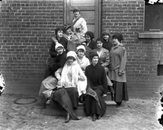 | Keywords: blackandwhite monochrome people black and white Meredith College Mars Hill Club. Photograph appears in the 1916 "Oak Leaves" Meredith College yearbook, page 102. Individuals identified include Eunice Bracket, Bert Brown, Alex Draughn, Clata Edwards, Ethel Anglish, Nell Fowler, Pearl Faulkner, Essie Martin, Nona Moore, and Mae Sprinkle. c. 1916 (8"x10" glass plate negative). From the J. C. Knowles Photograph Collection, State Archives of North Carolina, Raleigh, NC. Meredith College Mars Hill Club. Photograph appears in the 1916 "Oak Leaves" Meredith College yearbook, page 102. Individuals identified include Eunice Bracket, Bert Brown, Alex Draughn, Clata Edwards, Ethel Anglish, Nell Fowler, Pearl Faulkner, Essie Martin, Nona Moore, and Mae Sprinkle. c. 1916 (8"x10" glass plate negative). From the J. C. Knowles Photograph Collection, State Archives of North Carolina, Raleigh, NC. |