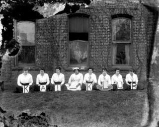 Keywords: blackandwhite monochrome outdoor black and white Kat Klub, aka Katydids, Meredith College; Raleigh, NC. Photograph appears in the 1916 "Oak Leaves" Meredith College yearbook, page 87. Individuals identified include Kate Jessup, Kate Copple, Kate Murray, Kate Beckwith, Kathleen Moss, Kathleen Covington, Kate Matthews, and mascot; Katherine, the Maid. c. 1916 (8"x10" glass plate negative). From the J. C. Knowles Photograph Collection, State Archives of North Carolina, Raleigh, NC. Kat Klub, aka Katydids, Meredith College; Raleigh, NC. Photograph appears in the 1916 "Oak Leaves" Meredith College yearbook, page 87. Individuals identified include Kate Jessup, Kate Copple, Kate Murray, Kate Beckwith, Kathleen Moss, Kathleen Covington, Kate Matthews, and mascot; Katherine, the Maid. c. 1916 (8"x10" glass plate negative). From the J. C. Knowles Photograph Collection, State Archives of North Carolina, Raleigh, NC.