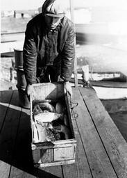 | Keywords: fishing commercial fishing commercialfishing north carolina northcarolina coast outer banks outerbanks blackandwhite monochrome outdoor black and white Shad fishing, Wanchese fisherman with crate of fish n.d. (1935-1940). From the Charles A. Farrell Photograph Collection, PhC.9, North Carolina State Archives, Raleigh, NC. Shad fishing, Wanchese fisherman with crate of fish n.d. (1935-1940). From the Charles A. Farrell Photograph Collection, PhC.9, North Carolina State Archives, Raleigh, NC. |