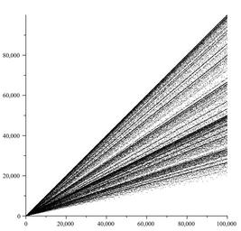 Keywords: Phi 100k.svg Point plot of totient of n <math>\phi n </math> for values of n up to 100000 Created using Maple 11 Own 2008-05-01 Saran T Totient function Maple diagrams