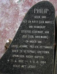 Keywords: Philip J Nel00.jpg en Memorial stone for Philip J Nel 1902-1984 Rugby Springbok farm Menneheim Greytown district South Africa Own Rotational 2009-04-18 Public domain Philip J Nel Uncategorized 2015 March 6