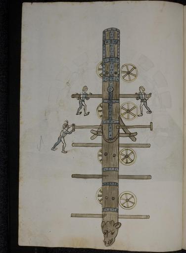 | Keywords: Philipp Mönch - Kriegsbuch - cod. pal. germ. 126 - 036.jpg Philipp Mönch - Kriegsbuch - cod pal germ 126 - jpg 035 037 de ;Kriegsbuch Dys büch der stryt vnd bůchßen Ward gemacht in der Vaßnacht als man zalt von cristus geburt 1496 11 -16 Februar 1496 jar dar uff soellen die buchßenmeister haben groß acht fer war Rammbock Die Form der Darstellung wechselt zwischen Auf- und Ansicht Philipp Mönch Kriegsbuch Papier 44 Bl 41x28 5 cm Heidelberg 1496 Cod Pal germ 126 Universtiätsbibliothek Heidelberg http //digi ub uni-heidelberg de/diglit/cpg126 1496 Philipp Mönch PD-old-100 Kriegsbuch Cod Pal germ 126 Battering rams |