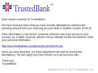 | Keywords: PhishingTrustedBank.png What a typical phishing e-mail may look like The bank here is fictional but it is to be assumed that a real phishing attempt would claim to be from an actual bank the customer belongs to Notice how it tries to establish authenticity by using the bank's logo and providing what appears to be link to a website the customer has been to many times before This mock-up was created by me on December 2 2005 and placed in the public domain Note the effect achieved by not using i before e except after c thus misspelling the word received Nội dung tiêu biểu của một thư điện thử giả mạo Nội dung được dịch như sau Gửi quý khách hàng của TrustedBank chúng tôi đã nhận được thông báo là bạn vừa yêu cầu rút tiền khi đang ở nước khác số tiền 135 5 Nếu thông tin này không đúng có lẽ ai đó đã sử dụng tài khoản của bạn Vì lý do an toàn xin m i đến website sau để xác nhận thông tin địa chỉ url Sau khi hoàn tất bộ phận an ninh của chúng tôi sẽ giải quyết sự thiếu nhất quán này Chúng tôi rất hân hạnh được trở thành đối tác của bạn Cảm ơn TrustedBank Los phishing son aquellos que hacen fraudes por medio de contraseñas tarjetas de credito o incluso hasta telefonos bancos email tambien es uno de los mas equipos demaciados avanzados en la tecnologia que saben como intimidar a un usuario sacandole informacion sin que este sospeche Tambien son personas que saben como manipular las redes sociales haciendo delitos por todas estas Estos se cambian los nombres por personas familiares a los usuarios con los que van a ser el fraude Los phishing son los mas reconocidos ladrones de redes sociales en las cuales la seguridad no ha podido acabar con estos delincuentes y detectarlos en el instante en que van a cometer el fraude Los phishing son buscados al nivel mundial sobre todo en los estados unidos que es el pais donde mas habitan y aprenden de estos delitos tambien se puede deducir que estas personas son super intelingentes al analizar las personas que tienen o con que podrian hacer buen gol tambien son muy habiles al hacer los robos en instantes sin levantar sospechas y estas personas usan incluso hasta identidades ajenas y colocando perfiles que no son en Image PhishingTrustedBank png Andrew Levine Andrew Levine Phishing Los phishing son ladrones de redes sociales las cuales roban cuentas en facebook hotmail y cuentas de tarjetas de crédito incluso hasta por vía telefónica Los phishing son un equipo muy avanzados con la tecnología ya que pueden robar cuentas disimulada mente en instantes sin levantar sospechas existen dos clases de hackers los de sombrero negro que utilizan una manera diferente de robar cuentas que los phishing y los de sombrero blanco que son en forma de anti phishing que envés de robar tu cuenta crean sistemas de seguridad para ella los phishing son muy buscado a nivel mundial sobre todo en lo estados unidos ya que ahí se presentan los indices mas altos de fraudes ya que la seguridad no ha podido evitar estos casos |